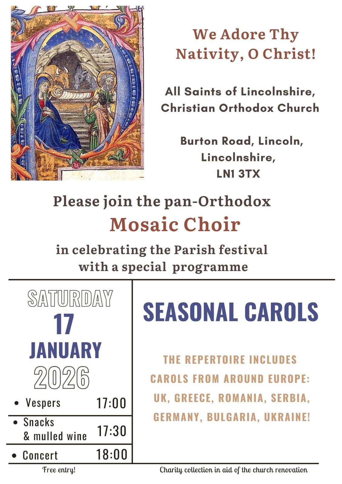 Join the Mosaic Choir in celebrating with Vespers and a concert of Seasonal Carols at the Parish Festival in Lincoln, and to Share in the Joy of the Incarnation of Our Lord, God, and Saviour, Jesus Christ!