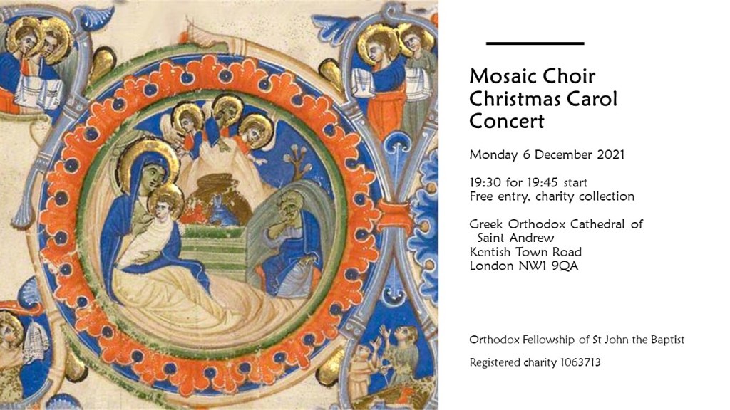 Mosaic Choir will be singing at the Orthodox Cathedral of St Andrew, Kentish Town, London on Monday 6 December at 19:30 for a 19:45 start. Please join the choir for their favourite carols from around the world! Free entry with a charity collection.